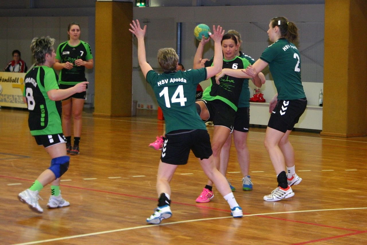 Die Gäste-Abwehr war nicht zimperlich. Hier wurde Jenny Mohrig gleich von drei Apoldaerinnen in die Zange genommen. (Foto: Uwe Tittel)