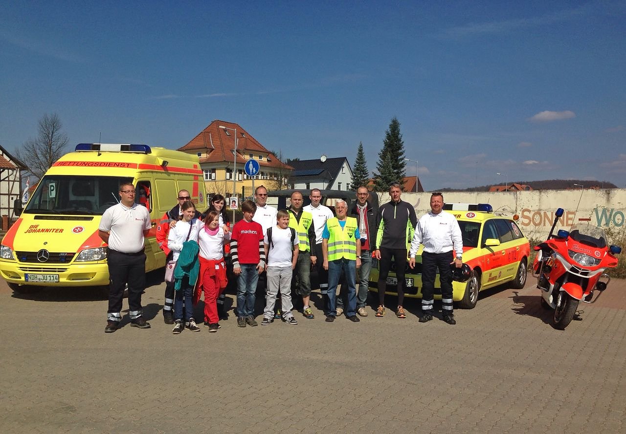Ein Einsatzleitfahrzeug, ein Rettungswagen, ein Geländefahrzeug, ein Motorrad sowie eine stationäre und mehrere mobile Sanitätsstationen waren im Dienst. Unterstützt wurden die 7 Johanniter-Rettungsassistenten und -sanitäter vom eigenen Nachwuchs: 2 Mädchen und 2 Jungs der Johanniter-Jugend Nordhausen schauten den Großen über die Schulter und unterstützten die Abläufe tatkräftig.