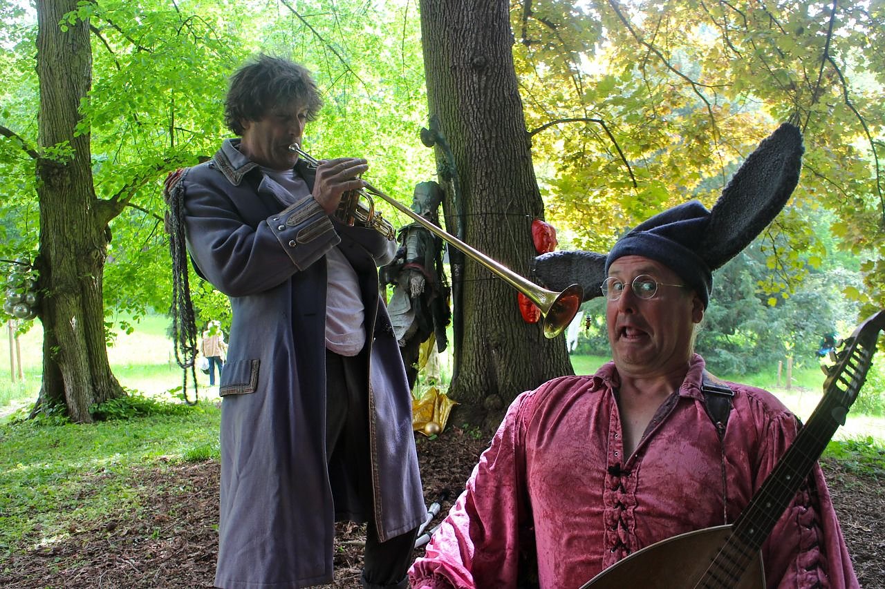 Autor: redPeter Röttig hat sich in Schale geschmissen, die Eröffnung des vierten Märchenpicknicks steht bevor. Mit schweren schwarzen Stiefeln, kleiner Brille, schiefem Hut mit Eselsohren, die Laute fest im Griff stapft er durch den Park Hohenrode.