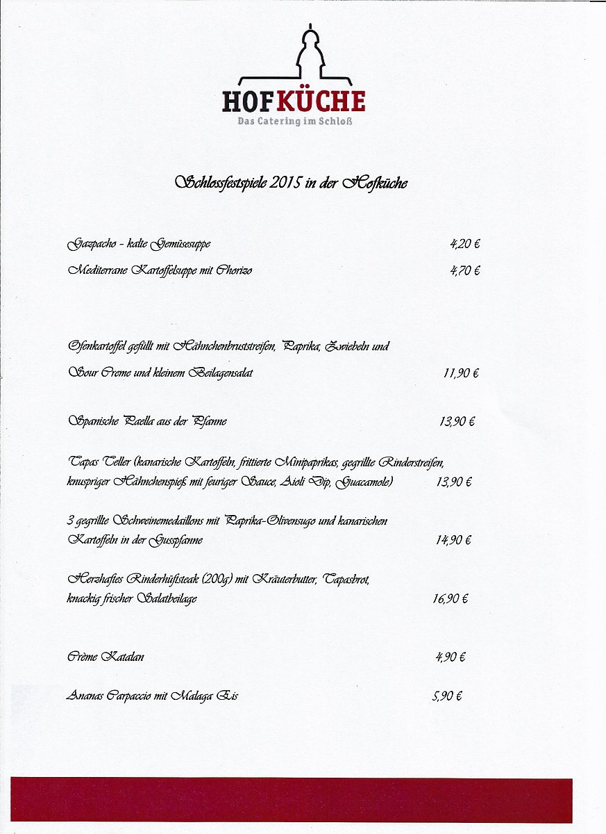 Dabei kann Ralf Dittman dieses Jahr auf die Erfahrungen des Vorjahrs zurückgreifen. Im Vorjahr hatte die Hofküche gerade mal einen Monat geöffnet und dann kamen schon die Schlossfestspiele. Dieses Jahr haben wir den Vorteil, nun mit einem eingespielten Team, dass sich im Vergleich zum Vorjahr nicht verändert hat, antreten zu können.