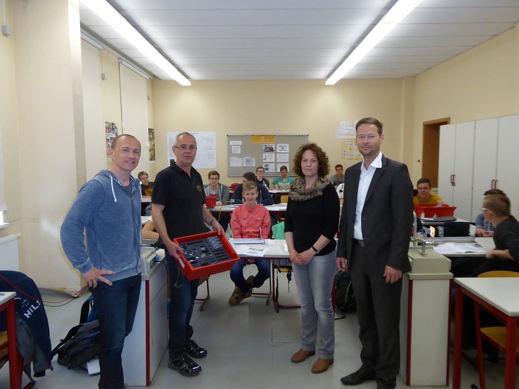 Von links: Rene Zschernig, Andreas Oppenhäuser Physiklehrer, Tonia Zschernig, Tino Pförtner Vorsitzender Förderverein bei der ersten Unterrichtserprobung