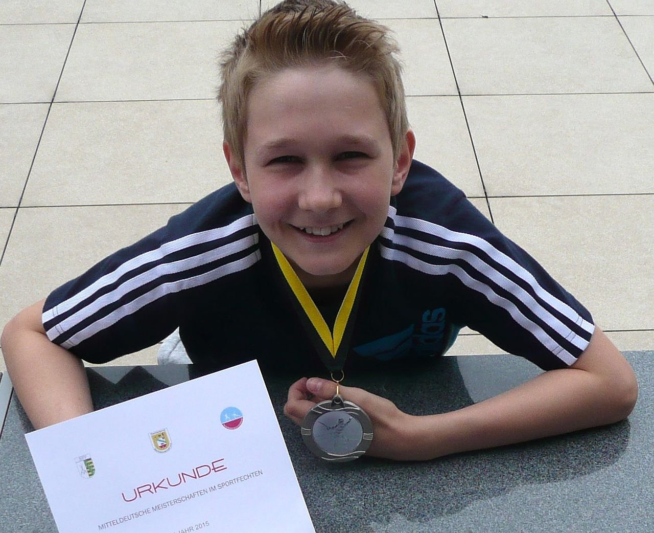 Aber auch Hendrik musste sich diesmal mit 10:6 geschlagen geben. Im Finale stand Teo dann dem Deutschen Meister Arwen Borowiak (FC Tauberbischofsheim) gegenüber und konnte das Gefecht bei wechselnder Führung lange ausgeglichen gestalten, bis er dann doch 10:7 verlor und damit stolzer Besitzer der Silbermedaille der Mitteldeutschen Meisterschaften wurde.