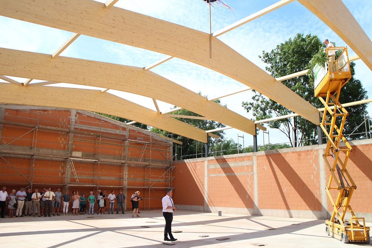 In den vergangenen zwei Wochen wurden die Leimholzbinder mit einer Spannweite von 20 m verlegt sowie die Dachkonstruktion des Anbaus errichtet. Die Größe der Sporthalle selbst beträgt 30 x 20 m. Etwa 90% der Leistungen sind bereits beauftragt. Bislang wurden rund 805.000 Euro verbaut.
