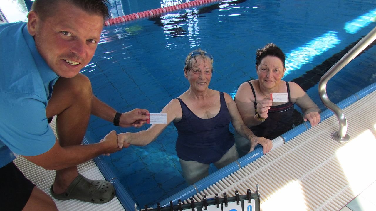 ...zwei Schwimmerinnen einen Rabattgutschein für 100 geschwommene Bahnen übergeben. Normalerweise schwimme ich wöchentlich 50 – 80 Bahnen. Das Angebot im Badehaus animierte mich, die 100 Bahnen voll zu machen, so Jutta Pietsch.
