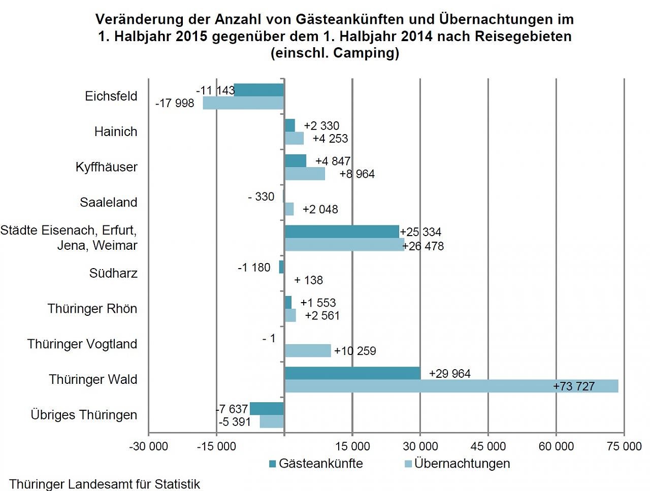 Die meisten Thüringer Reisegebiete können für das 1. Halbjahr 2015 auf eine positive Entwicklung ihrer Gäste- und Übernachtungszahlen verweisen. Das größte Reisegebiet, der Thüringer Wald, konnte mit einem Plus von 29 964 Gästen (+ 4,9 Prozent) und einem damit verbundenen Anstieg von 73 727 Übernachtungen (+ 4,0 Prozent) ein gutes Ergebnis erzielen. Auch im Bereich des Städtetourismus (Eisenach, Erfurt, Jena und Weimar) konnte für das 1. Halbjahr 2015 ein beträchtlicher Anstieg der Gästezahlen (+ 25.334 bzw. 4,8 Prozent) und Übernachtungen (+ 26.478 bzw. 2,8 Prozent) er-reicht werden.