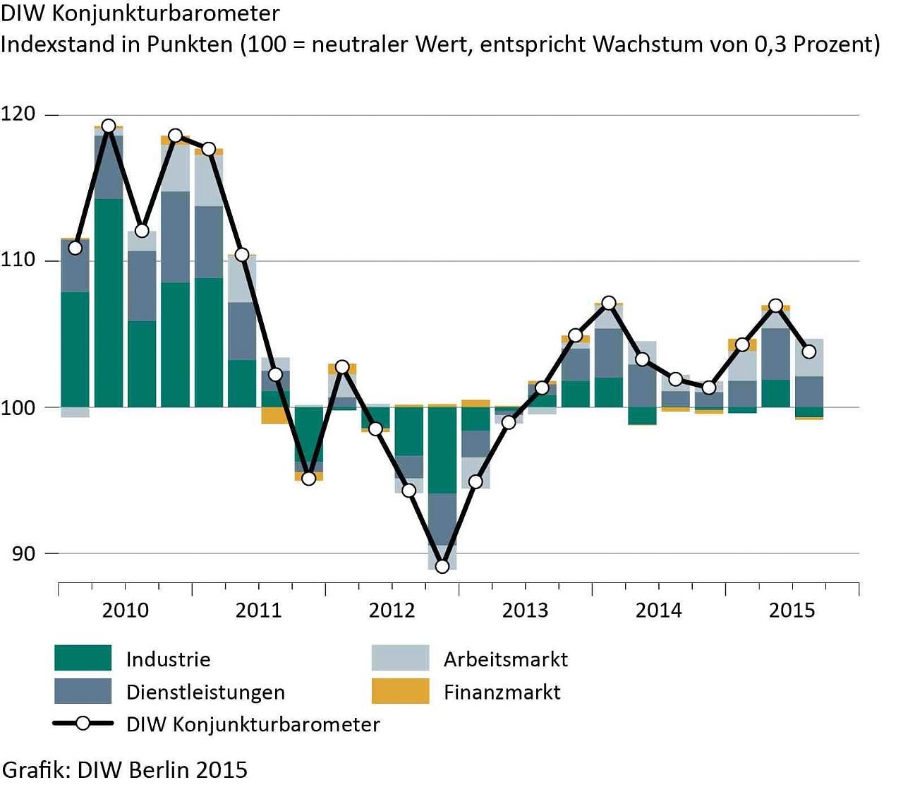 DIW-Konjunkturchef Ferdinand Fichtner dämpft aber allzu überschwängliche Erwartungen: Im Zuge der angespannten Lage im Euroraum, aber auch der Sorgen um die chinesische Wirtschaft und einer insgesamt etwas schwächeren Weltkonjunktur könnte die deutsche Wirtschaft schon bald etwas an Schwung verlieren.