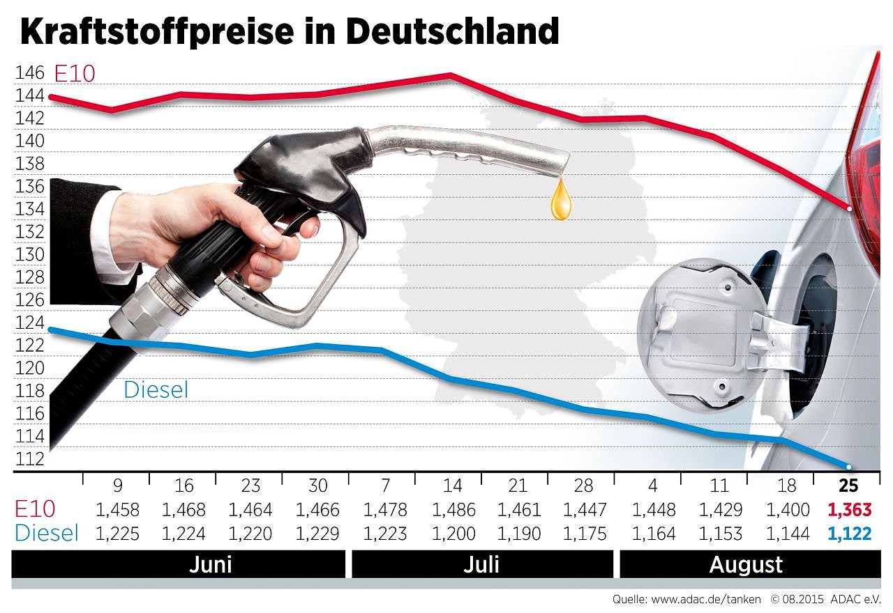 Da der Benzinpreis deutlich stärker sinkt als der des Diesels, schließt sich die Preisschere weiter. Aktuell beträgt der Unterschied zwischen den Kraftstoffsorten rund 24 Cent und nähert sich damit der steuerlichen Differenz von 22 Cent. Anfang August war Benzin noch mehr als 28 Cent teurer.