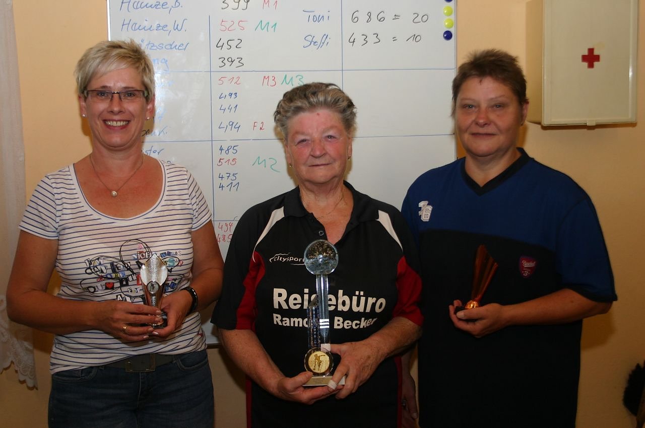Auch Siegerin Toni Herrmann machte sich das Leben selber schwer. Nur 110 Kegel auf ihrer zweiten Bahn. Und vor ihrem allerletzten Wurf stand noch vier Kegeln. Drei hätten fallen müssen, um die bis dahin führende Steffi Boenki an der Spitze abzulösen. Es fielen aber nur zwei. Gleichstand und damit erstmals in der Geschichte ein Stechen um den Vereinsmeistertitel. Je drei Wurf abwechselnd in die Vollen mussten die Entscheidung bringen. Und da erwies sich die Altmeisterin mit 20:10 als die klar Bessere. Ines Werner erging es wie Heike Hase. Auch sie ließ auf ihrer zweiten und vierten Bahn zu viel stehen.