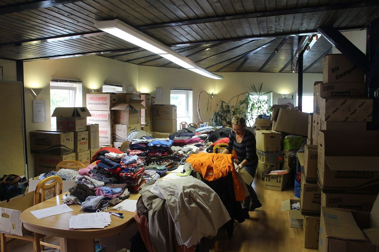 Auch Loni Grünwald, ehemals Beigeordnete des Landkreises und seit einiger Zeit im Ruhestand, ist in der Halle. Zusammen mit fünf anderen Freiwilligen hat sie es sich zur Aufgabe gemacht, beim sortieren der Spenden zu helfen. Eigentlich macht sie das in den Räumen des LIFT Vereins. Während Frau Grünwald bei der Verteilung in der Turnhalle hilft, steht hier Birgit Freiberg, ebenfalls Ruheständlerin, und kämpft sich durch Berge an Kleidern, Hosen und T-Shirts. Seit vergangenem Donnerstag hat sich der Konferenzraum des LIFT bis unter das Dach mit Spenden gefüllt, erzählt sie. "Die Sachen kommen nicht aus der normalen Kleiderspende, die Leute bringen die Sachen selber hierher und wollen sicher stellen, dass ihre Spenden auch ja bei den Flüchtlingen ankommen", erzählt Frau Freiberg.