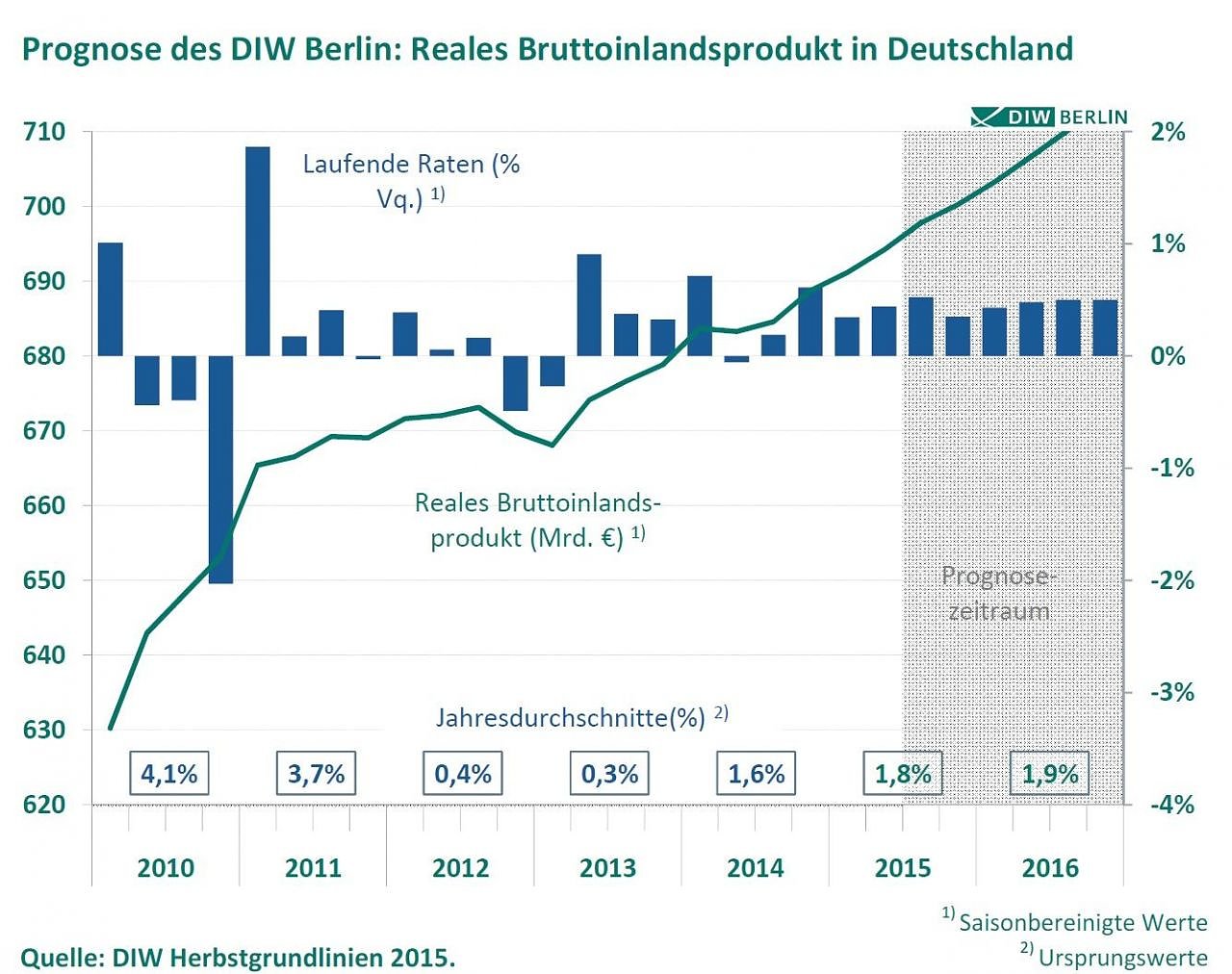 In Deutschland bleibt das Wachstum robust. Vor allem die Binnenkonjunktur präsentiert sich schwungvoll: Die Löhne steigen stärker als die Preise – die Inflation dürfte in diesem Jahr bei 0,4 Prozent und im kommenden Jahr bei 1,4 Prozent liegen. Das schiebt den Konsum merklich an. Die Unternehmen bleiben aber zurückhaltend, wenn es darum geht, wieder mehr zu investieren. Trotz der niedrigen Zinsen und zunehmend ausgelasteter Kapazitäten weiten sie ihre Ausrüstungsinvestitionen nur verhalten aus: Zwar laufen die Exporte trotz der schwächelnden Schwellenländer weiterhin gut, allerdings überwiegen die Unsicherheiten über die Entwicklung in wichtigen Absatzmärkten, allen voran in China und Russland sowie die Sorgen um die Zukunft des Euroraums.Die Beschäftigung steigt derweil weiter und sorgt dafür, dass die Arbeitslosenquote in diesem Jahr erneut zurückgeht – auf 6,4 Prozent. Im kommenden Jahr wird sie auf diesem Niveau verbleiben, trotz der zunehmenden Zahl an Zuwanderern. So geht das DIW Berlin davon aus, dass in diesem Jahr rund 50.000 Personen, die als Flüchtlinge nach Deutschland gekommen sind oder noch kommen, eine Beschäftigung suchen werden; im nächsten Jahr wären es gut 120.000 Personen. Unterstellt ist dabei, dass in beiden Jahren jeweils etwa 800.000 Menschen als Flüchtlinge nach Deutschland kommen.