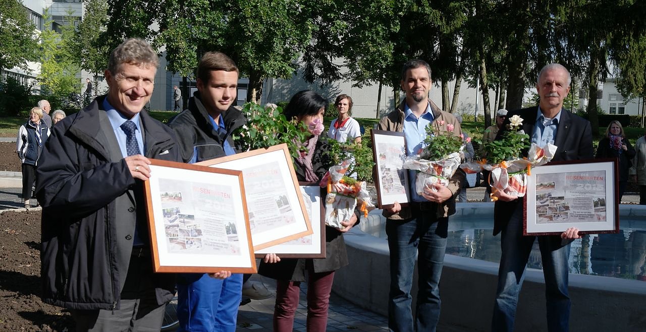 Stellvertretend für all Unterstützer erhielten die Vertreter von Lionsclub, Wasserverband, Südharz Klinikum und Schachtbau Nordhausen eine Fotomontage und einen Rosenpflanze. Oberbürgermeister Zeh hält hier die Urkunde für das Bauunternehmen Waresa.Als Vertreter des Klinikums sagte Kai Buchmann, dass den Rosengarten nicht nur viele Patienten und deren Angehörige, sondern auch Mitarbeiter des Klinikums und Bewohner des nahe gelegenen Pflegeheims als Insel der Ruhe und Entspannung nutzen würden.