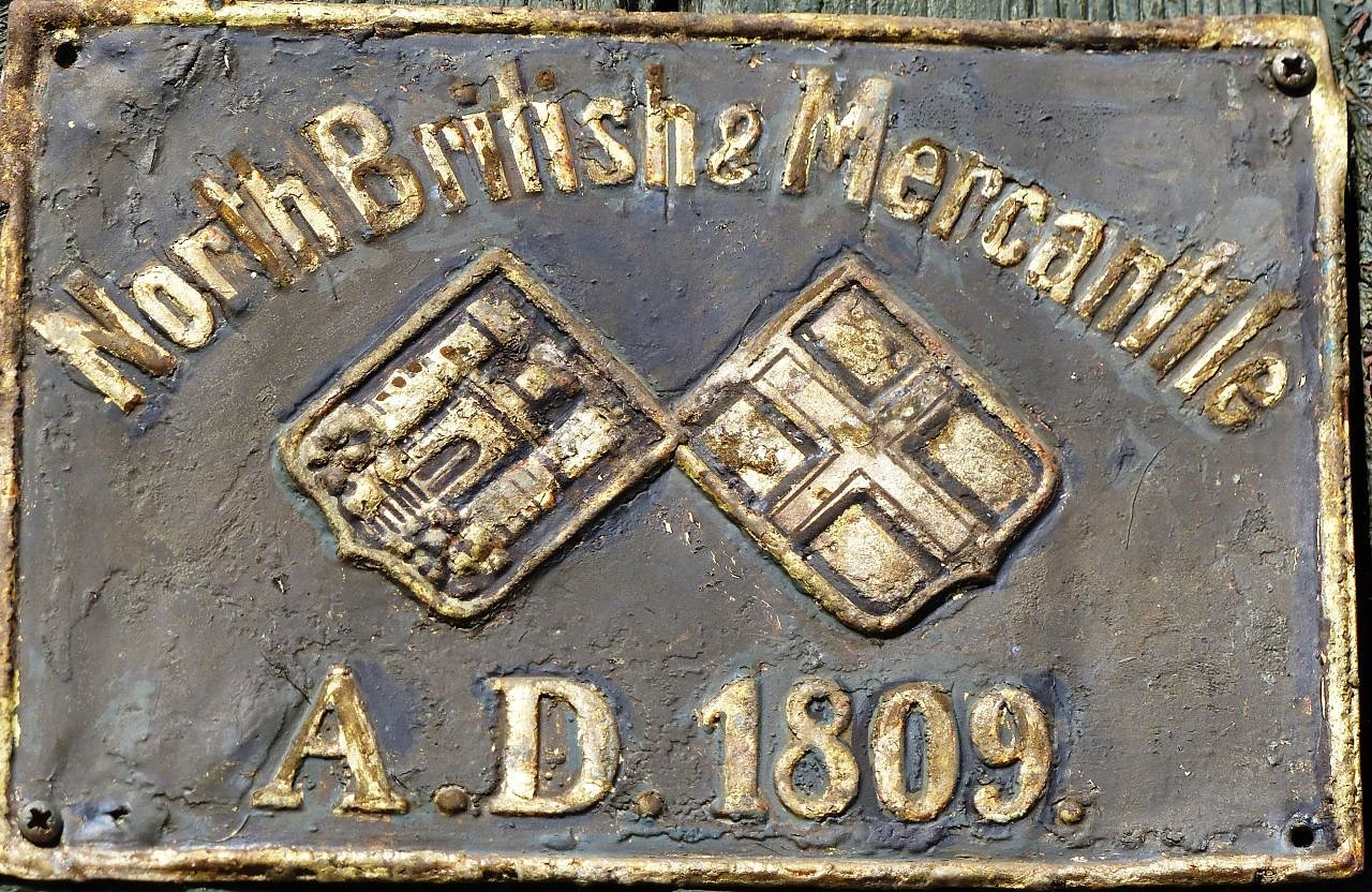 Betrachtet man die Details dieses Firmenlogos genauer, so findet man den Namen North British & Mercantile, das Jahr A.D. 1809 und zwei Wappen. Ein weiteres Mal Wappen, die man nicht Ellrich oder der Grafschaft Hohnstein zuordnen kann – hier soll nochmals an das Wappen mit den Lilien der Bourbonen erinnert werden, das man in dem Ellricher Ortsteil Wilmersdorf findet.