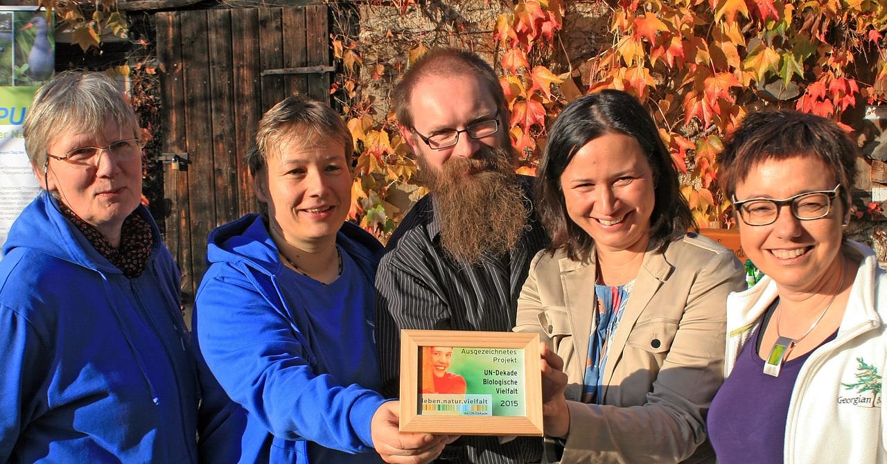 Der Lange Tag der Natur wurde jetzt erneut als offizielles Projekt der UN-Dekade Biologische Vielfalt ausgezeichnet. Das neue Logo zur Auszeichnung, mit dem sich der Lange Tag der Natur ab diesem Tag in der Öffentlichkeit präsentieren darf, überreicht Thüringens Umweltministerin Anja Siegesmund im NABU-Infozentrum in Jena-Leutra.