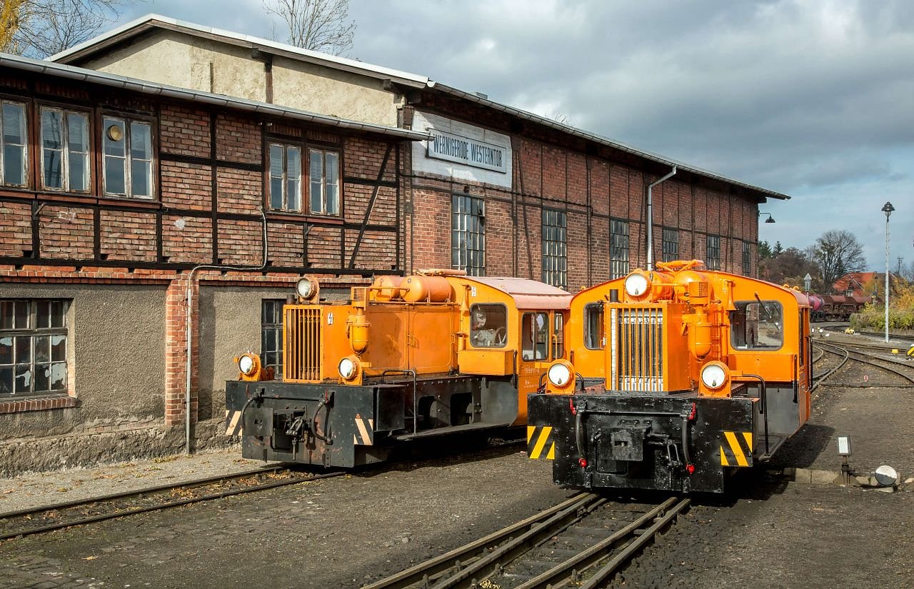 Zusammentreffen an der Fahrzeugwerkstatt Wernigerode Westerntor: 199 011 (links) und Nachfolgerin 199 012 strahlen in der NovembersonneMit den Kleinloks 199 010 – 199 012 verfügt die HSB über drei ganz besondere Diesel-Exoten in ihrem Fuhrpark. Ursprünglich einmal als regelspurige Rangierlokomotiven des Typs Kö II gebaut, gelangten sie erst relativ spät in das nördlichste Mittelgebirge Deutschlands.