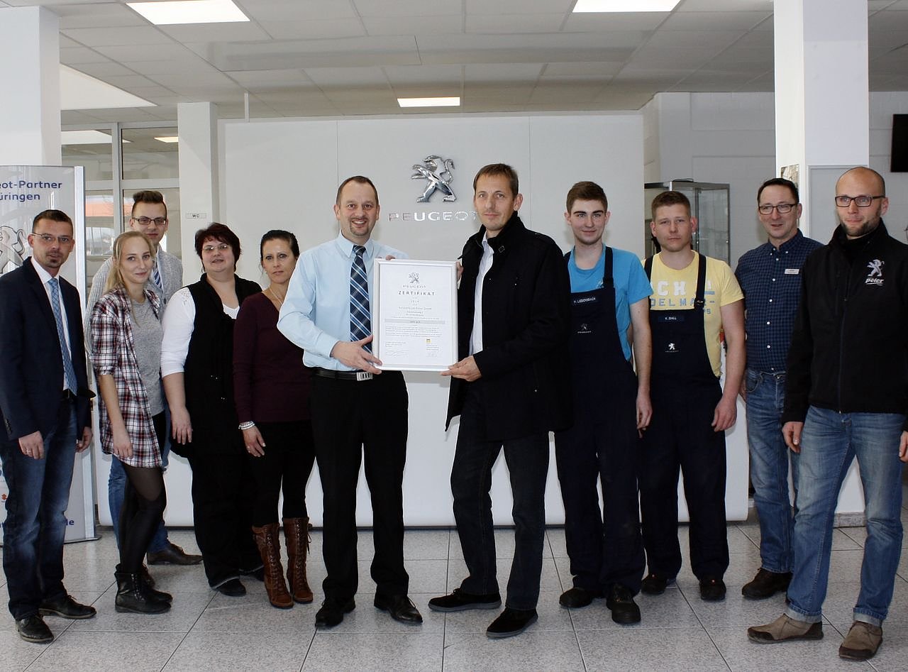 Steffen Glöckner, Teile- und Kundendienstmanager Peugeot/PSA übergibt die Urkunde mit dem Prädikat "Sehr gut" an Maik Lüdecke (Mitte).Doch für die Teams vom Peugeot-Autozentrum Peter in Nordhausen und Sangerhausen ist jeder Kunde ein potenzieller Tester. Alle Mängel müssen gefunden und behoben werden, der Kunde muss das Autohaus zufrieden verlassen und gern wiederkommen. Der Dienst am Kunden und die Qualität unserer Arbeit haben für uns Priorität, betont Centerleiter Maik Lüdecke.