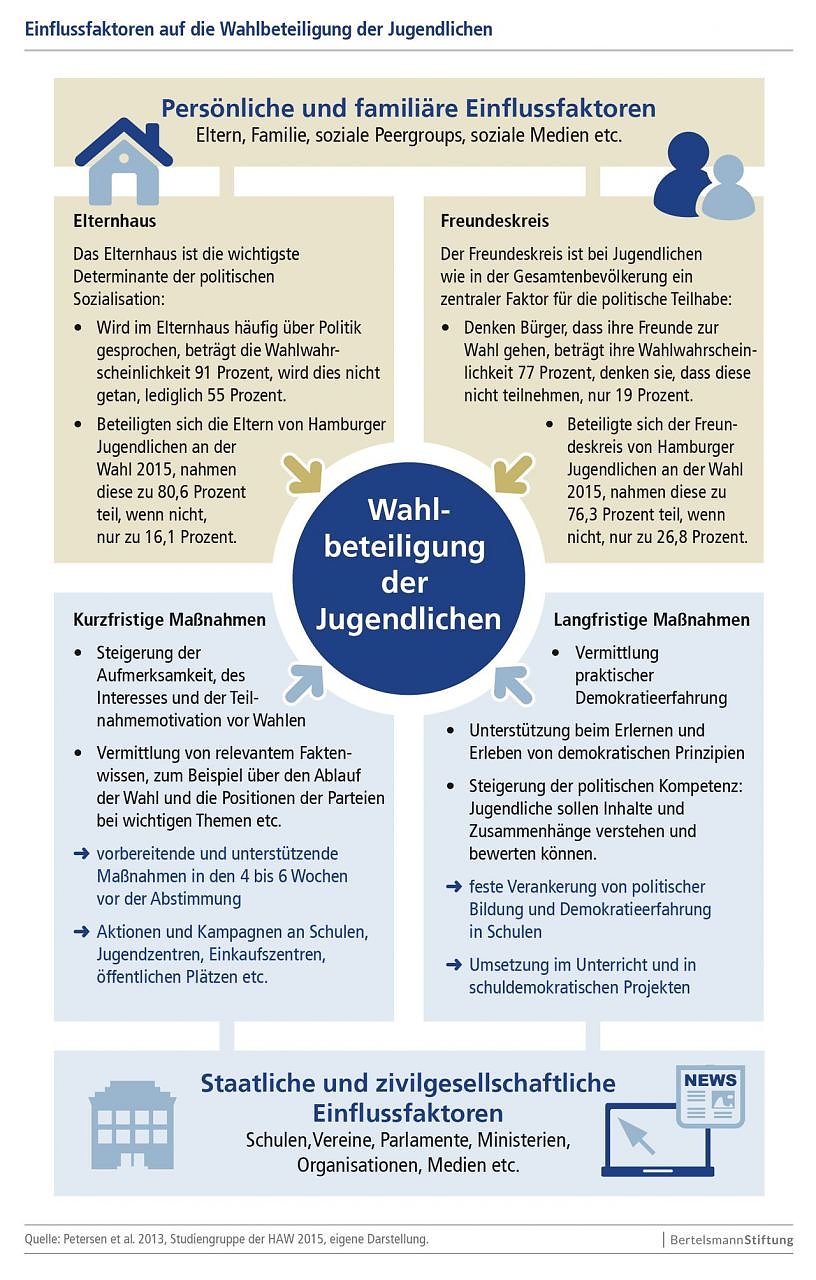 Zusätzlich wurden für die Studie die Ergebnisse einer repräsentativen Bevölkerungsumfrage berücksichtigt, die das Institut für Demoskopie Allensbach im Auftrag der Bertelsmann Stiftung zum Thema Wählen ab 16 im September 2015 durchgeführt hat.