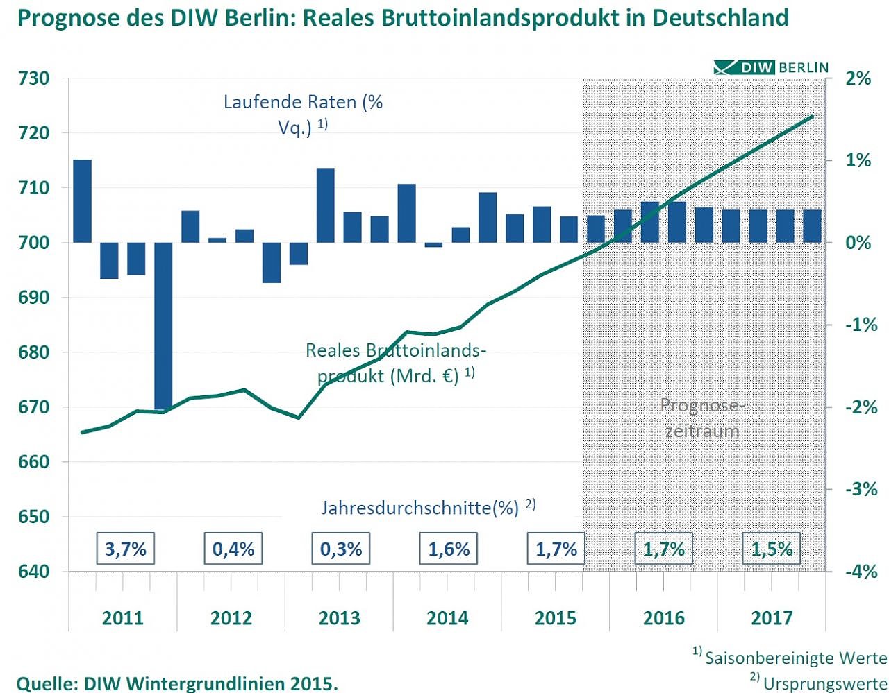 In Deutschland wird die Wirtschaftsleistung in den nächsten Quartalen leicht überdurchschnittlich wachsen. Die Unternehmen werden sich mit Investitionen jedoch auch weiterhin zurückhalten, nicht zuletzt aufgrund bestehender Unsicherheiten über die weltwirtschaftliche Entwicklung und die Ausrichtung des Euroraums beziehungsweise der Europäischen Union. Wachstumstreiber ist derzeit der private Konsum, der im laufenden Jahr allerdings auch von den gesunkenen Energiepreisen beflügelt wurde.Die gute Lage auf dem Arbeitsmarkt hält aber an: Die Zahl der Erwerbstätigen wird in den kommenden beiden Jahren auf neue Höchststände steigen und die Lohnsumme um rund vier Prozent pro Jahr expandieren. Allerdings nimmt auch die Arbeitslosenquote zu, weil die Zahl der Erwerbspersonen merklich steigt, auch weil wohl immer mehr anerkannte Asylbewerber auf den Arbeitsmarkt kommen. Nach 6,4 Prozent in diesem und 6,5 Prozent im kommenden Jahr wird sie 2017 voraussichtlich bei 6,8 Prozent liegen.