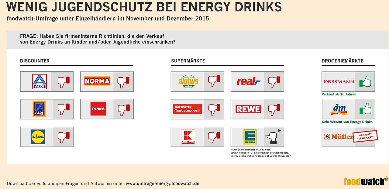 Bei Lebensmitteleinzelhändlern gibt es dagegen bislang keine Verkaufsbeschränkung für die Getränke, wie die Unternehmen Aldi Nord und Süd, Globus, Kaisers Tengelmann, Kaufland, Lidl, Norma, Penny, Real und Rewe auf Anfrage von foodwatch bestätigten. Edeka gab lediglich an, dass es in einzelnen Regionen unverbindliche "Empfehlungen" gebe, Energy Drinks nur an mindestens 16-Jährige abzugeben. Globus erklärte zudem gegenüber foodwatch, die Abgabe an Kinder und Jugendliche zu "prüfen". Andere Handelsunternehmen verwiesen auf fehlende gesetzliche Vorgaben. "Für diese Getränkesorte gibt es kein gesetzlich festgelegtes Alter für den Verkauf", begründete exemplarisch Real den Verzicht auf Jugendschutzmaßnahmen. Drogerist Müller verweigerte eine Auskunft.