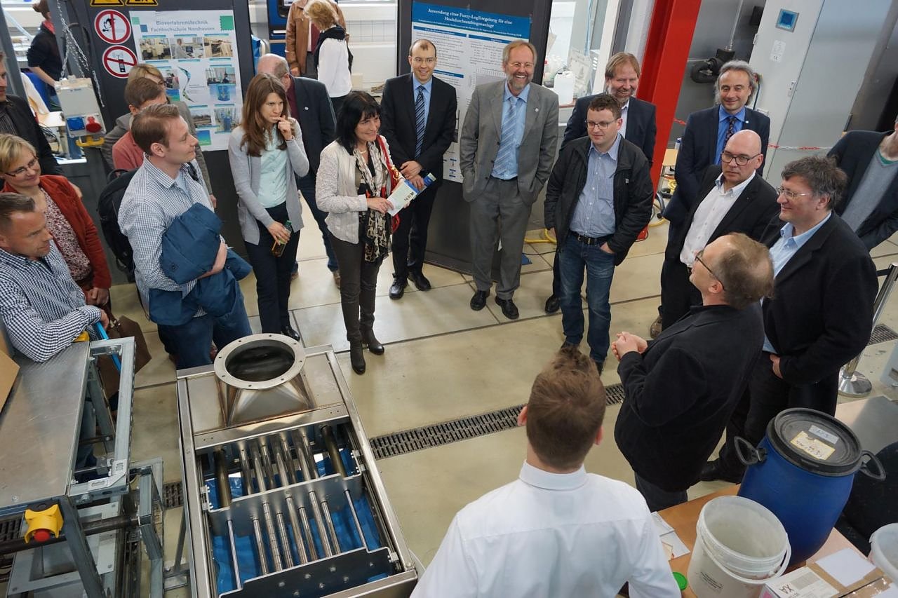 Nach der Veranstaltung informierten sich die Teilnehmer über die technischen Möglichkeiten an der Hochschule Nordhausen und dem dazugehörigem AUGUST-KRAMER-INSTITUT (AKI). Neben aktuellen Forschungsprojekten wurden etablierte und leistungsstarke Apparate zur Erzeugung von Biogas, Sortierung von Wertstoffen und Magnetabscheidung von den Professoren Uta Breuer, Folker Flüggen und Thomas Link demonstriert.