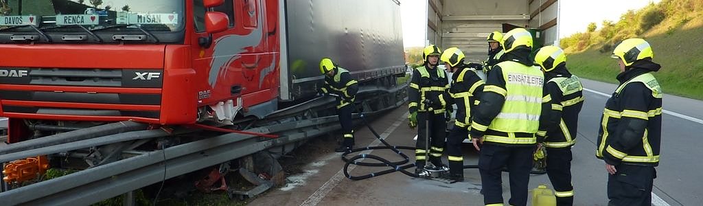 An einem tschechischen Sattelzug platzte der vordere linke Reifen der Zugmaschine, das Fahrzeug kam nach links von der Fahrbahn ab und durchbrach die Mittelleitplanke auf einer Länge von 100 Meter.