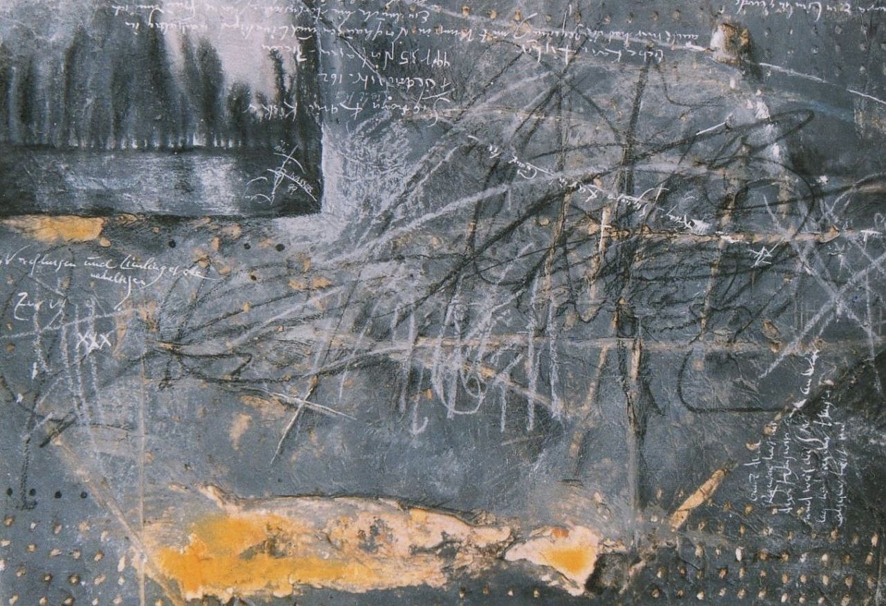Kisker wird mit weißem Pigment arbeiten, mit schwarzer Beize, Schuhcreme einsetzen und einen Schwingschleifer. Auch Schriftzeichen wird sie verwenden, Teile von ihnen sind unleserlich. Ab und zu jedoch ist etwas zu entziffern, aber alles zusammen soll keinen Inhalt ergeben, sondern Form bleiben. Zur Sicherheit stellt sie die Schriftzüge auf den Kopf. Als kleines Bild im Bild entsteht eine Pappelreihe am Wasser - Stück Natur!