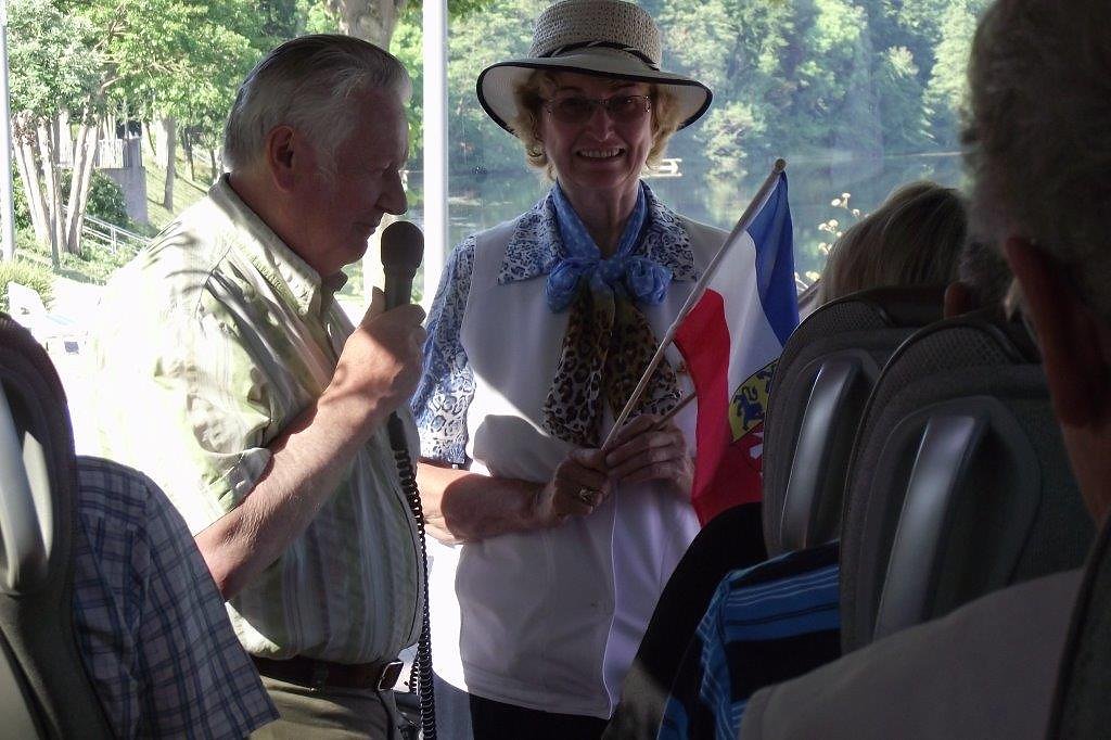 Vereinsvorsitzender Herbert Weschcke verabschiedete im Bus Heidi Freymark, die feuchte Augen bekam. (Foto: Kurt Frank)