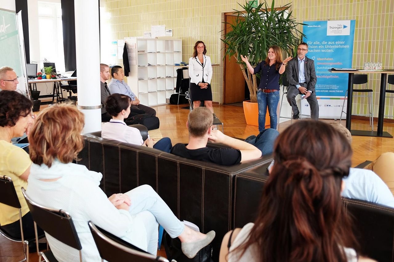 Mit diesem Impuls startete danach eine Podiumsdiskussion mit drei Existenzgründern: Als Gründungen aus dem Bereich der Industrie- und Handwerkkammer nahmen Annekathrin Kirchner, Friseurmeistern und Inhaberin des Salons Unikat, sowie Zhao Chen, Informatiker und Inhaber der OCTONA Solutions UG teil. Eric Benkenstein, Absolvent des Bachelorstudienganges Internationale Betriebswirtschaft der Hochschule Nordhausen und kaufmännischer Geschäftsführer von mobeee vertrat die Perspektive einer Gründung aus der Wissenschaft. Moderiert wurde die Podiumsdiskussion von Steffen Peter, Handwerkslotse des ThEx, und Dr. Kareen Schlangen seitens der Hochschule Nordhausen. Zu Fragen nach den größten Hürden, dem stärksten Auslöser oder der hilfreichsten Unterstützung in der Existenzgründung ermöglichten die Gründer und Unternehmer einen interessanten Einblick in ihre ganz persönliche Geschichte. Auch hier zeigte sich immer wieder, dass Gründungen keinem idealtypischen Prozess folgen, jede ihren ganz individuellen Charakter hat und eines ganz wichtig ist: die Leidenschaft für die Selbständigkeit.
