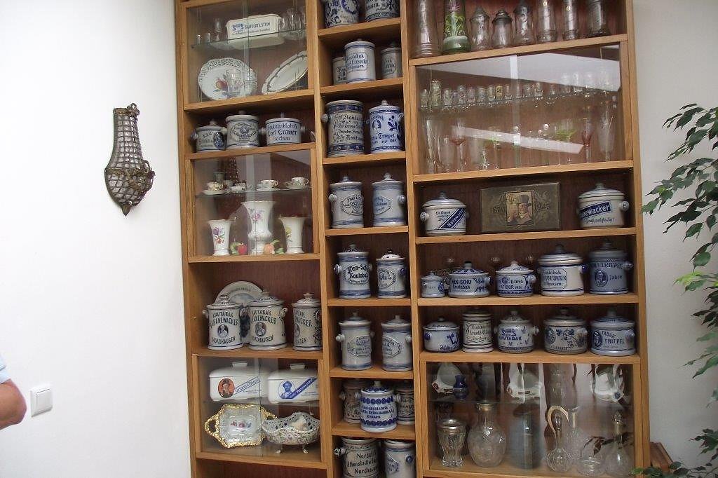 Eine Vitrine voller Kautabaktöpfe. Auch Werbe-Schnapsgläser einstiger Firmen finden sich. Foto: Kurt Frank