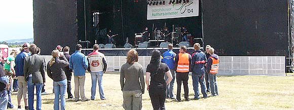 ....doch das Publikum ließ zu dieser Zeit noch auf sich warten. Knapp zehn zahlende Zuschauer und Zuhörer waren zum Festival-Auftakt. Wie ein Vertreter der Stadt Nordhausen sagte, seien im Vorverkauf rund 100 Karten abgesetzt worden. Wer also noch Lust hat, sich alternativen Rock reinzuziehen, der ist auf dem Festivalgelände herzlich willkommen. Platz gibt es auf dem Segelflugplatz noch genug und auch der noise-Pegel stimmt.