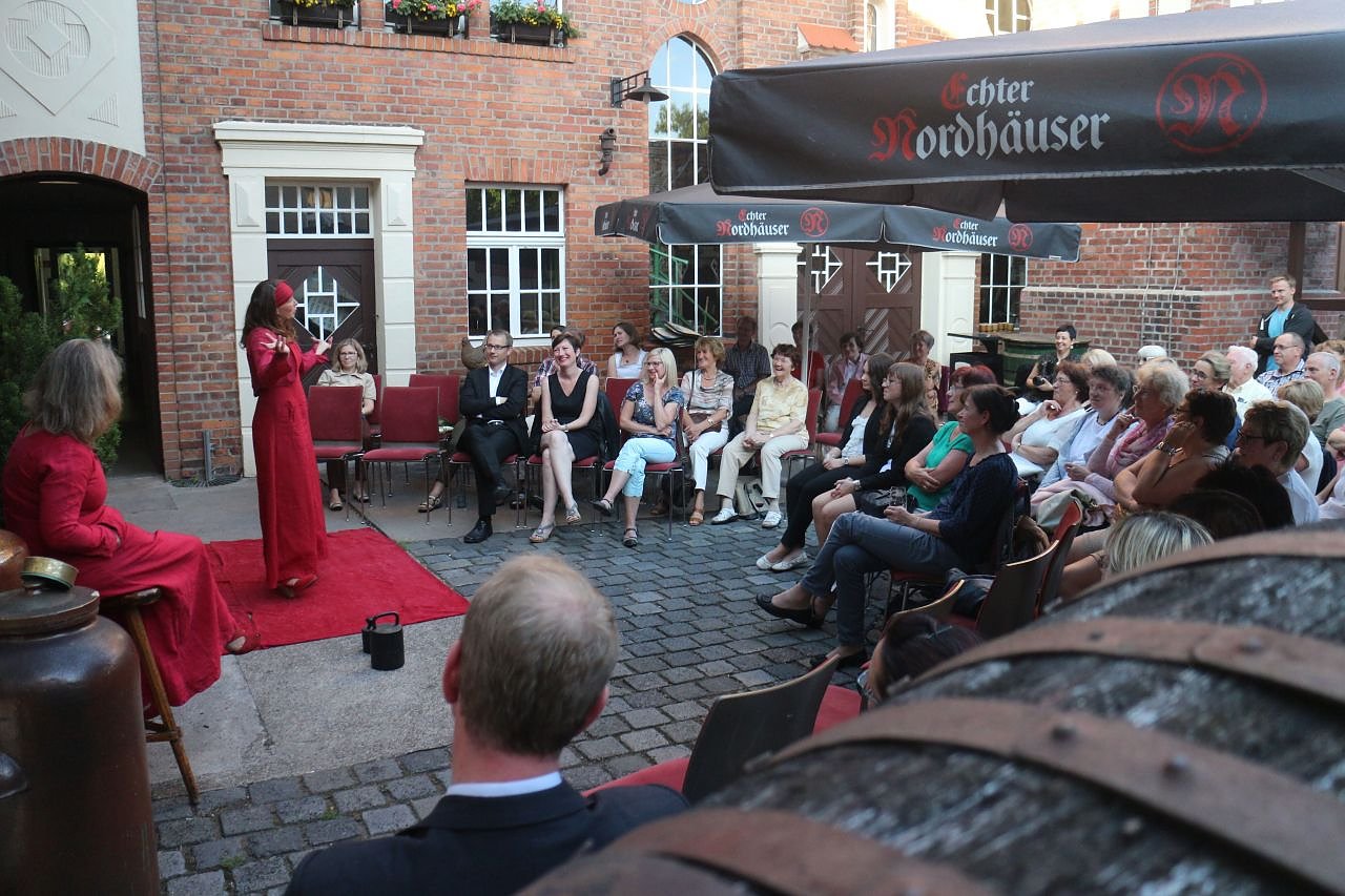 Das Publikum sind keineswegs Kindergartengruppen oder Schulklassen, sondern Erwachsene und es blieb kein Platz unbesetzt. Zum dritten Mal hat die Kreissparkasse das Erzählerduo "Fabula Drama" für ihr kulturelles Sommerprogramm nach Nordhausen geholt, nach dem Park Hohenrode und der Traditionsbrennerei hatte man gestern mit der alten Brennerei in ein weiteres Kulturdenkmal der Stadt geladen um den Gästen "etwas für die Seele zu bieten", wie sich Sebastian Gräser von der Kreissparkasse ausdrückte.