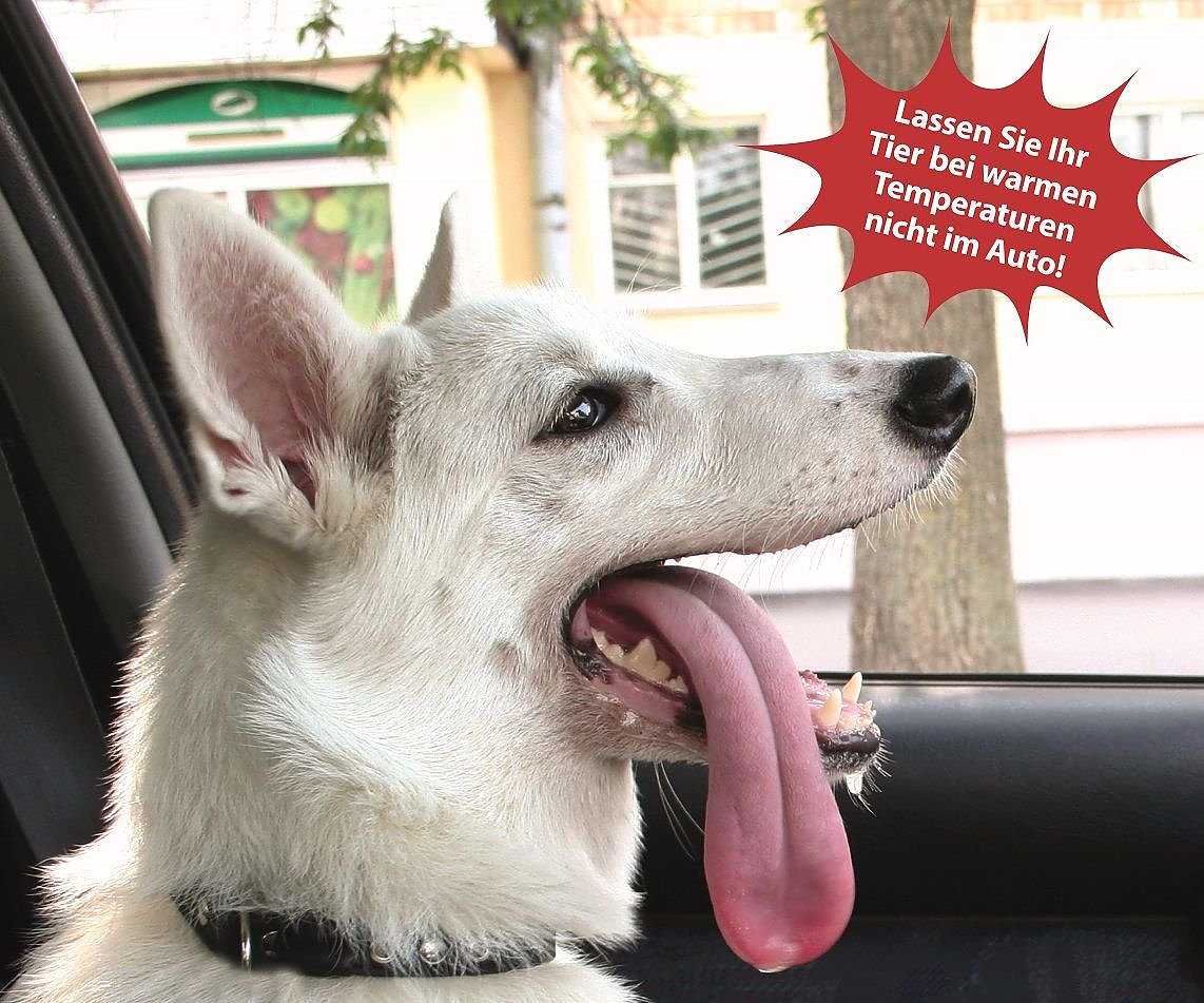 Auf gar keinen Fall dürfen Hunde und andere Tiere alleine im Auto gelassen werden, auch nicht für wenige Minuten. Selbst wenn das Auto im Schatten geparkt wird oder der Himmel bewölkt erscheint, kann die Sonne schnell und unbemerkt auftauchen oder wandern. Autos heizen sich schnell auf Temperaturen von bis zu 50 Grad auf – eine tödliche Falle für Tiere, die sich noch darin befinden. Das Fenster einen Spalt geöffnet zu halten, ist absolut nicht ausreichend.Glasiger Blick, tiefrote Zunge und Hecheln mit gestrecktem Hals sind einige Anzeichen dafür, dass Hunden die Hitze zu sehr zusetzt. Außerdem sind Erbrechen, Gleichgewichtsstörungen und schließlich Bewusstlosigkeit Anzeichen für einen Hitzschlag, der im schlimmsten Fall zum Tod des Tieres führt. Wenn Symptome auftreten, die auf einen Hitzschlag deuten, ist so schnell wie möglich ein Tierarzt aufzusuchen. Auf dem Weg dorthin kann man das Tier in der Zwischenzeit mit feuchten Handtüchern abkühlen.