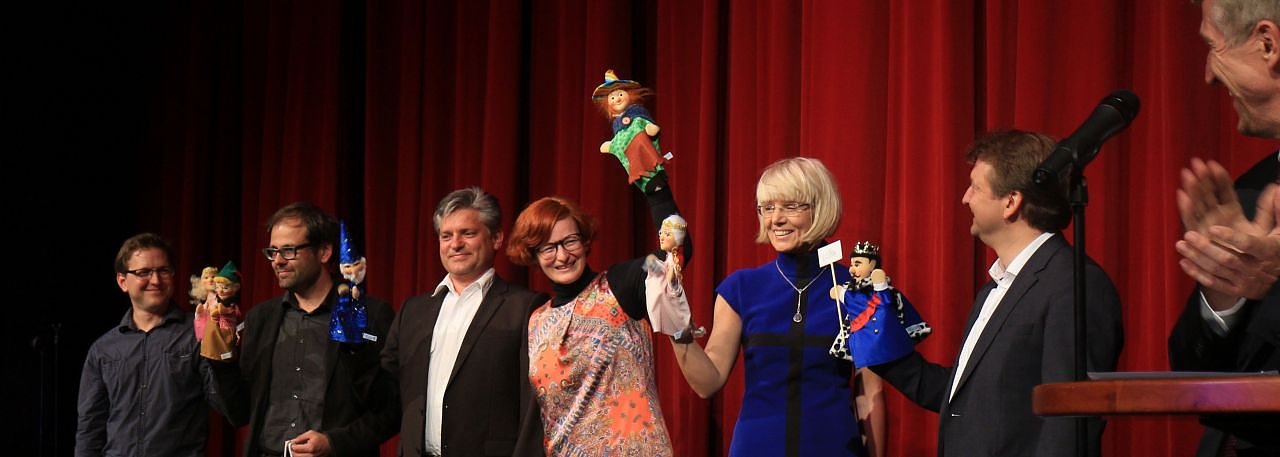 Auf Geschenke hatte man in der Einladung ausdrücklich verzichtet, lieber sollte man für die Fördervereine spenden. Die beiden Bürgermeister hatten sich dennoch etwas einfallen lassen, etwas das zur Kreativität der Bühne passte. Die sechs Theatermacher bekamen kleine Handpuppen, "König Lars" und "Königin Angelika", den "Zauberer Markus" und andere.