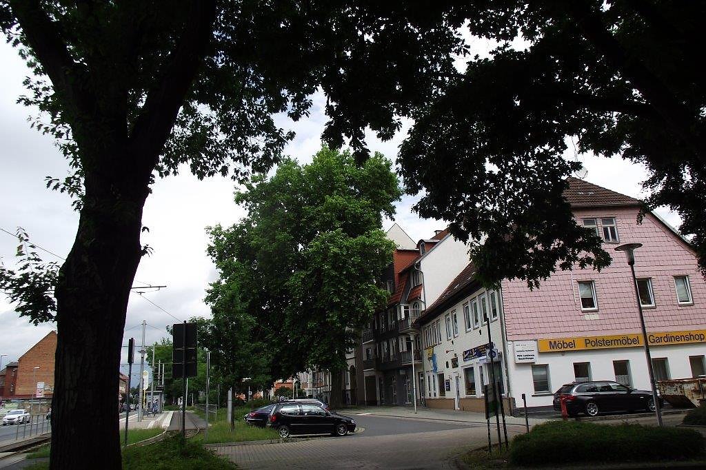 Beeindruckend das grüne Band in der Grimmelallee, wie Rautenstraße eine ebenso stark frequentierten Verkehrsverbindung. Mit Bordsteinen zwischen 50 Zentimetern und 1,20 Meter vom Stamm entfernt eingefasst, bleibt den Rot-Eichen etwas mehr Freiraum, Wasser zu ziehen, als Straßenbäumen allgemein zugestanden wird. Sie sollen erst, man mag es ob ihrer Größe kaum glauben, in der 1950er Jahren gesetzt worden sein, informiert Sven Gerwien. Die Baumreihen dämmen den Lärm der Straße erheblich ein, lassen die Allee einladender und freundlicher als Gesamtbild erscheinen. Ein Plus für Natur, Umwelt, Mensch. Alles überragend die mächtige Platane mit einer Einfassung zwischen 1,80 und 2,20 Meter. Sie könnte älter als die Eichen sein. In ihrer Nähe der seltene Ginkgo. Auch in der Grimmelallee erfolgten Eichen-Neupflanzungen. Weitere sind notwendig, wie zu sehen ist.