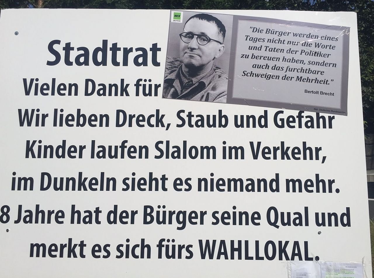 Anlieger der Straße hatten damals ein Schild aufgestellt. Mittlerweile wurde der Inhalt des Protestplakats relativiert, der Name Investor wurde mit einem Brecht-Zitat überklebt.