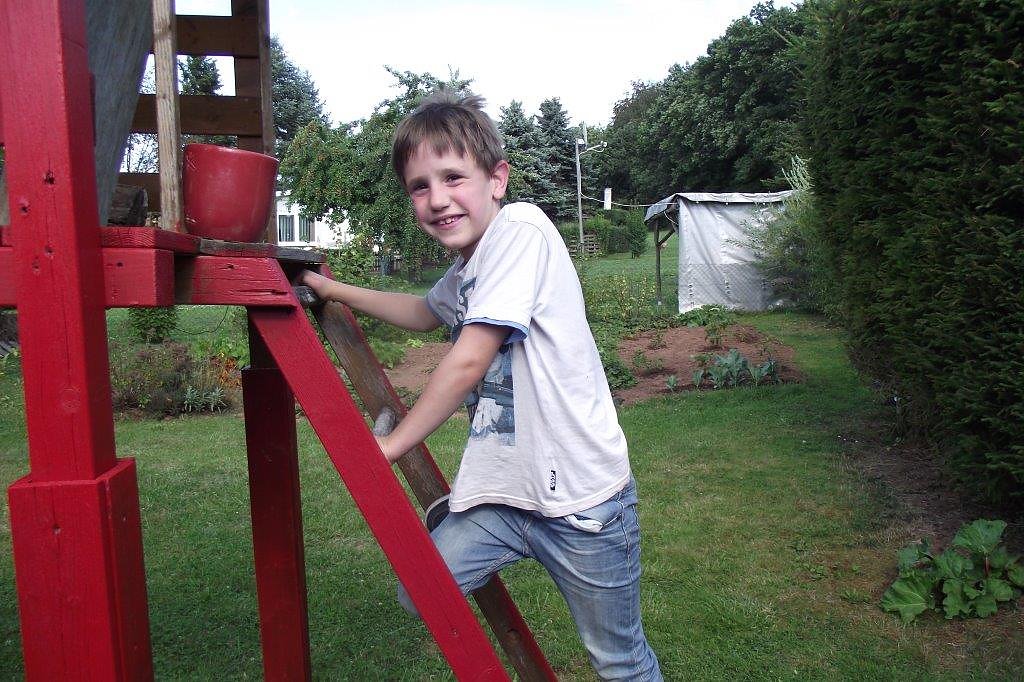 Leon besteigt seinen Hochsitz. Dort hat er einen guten Überblick über den Kleingarten seiner Eltern.