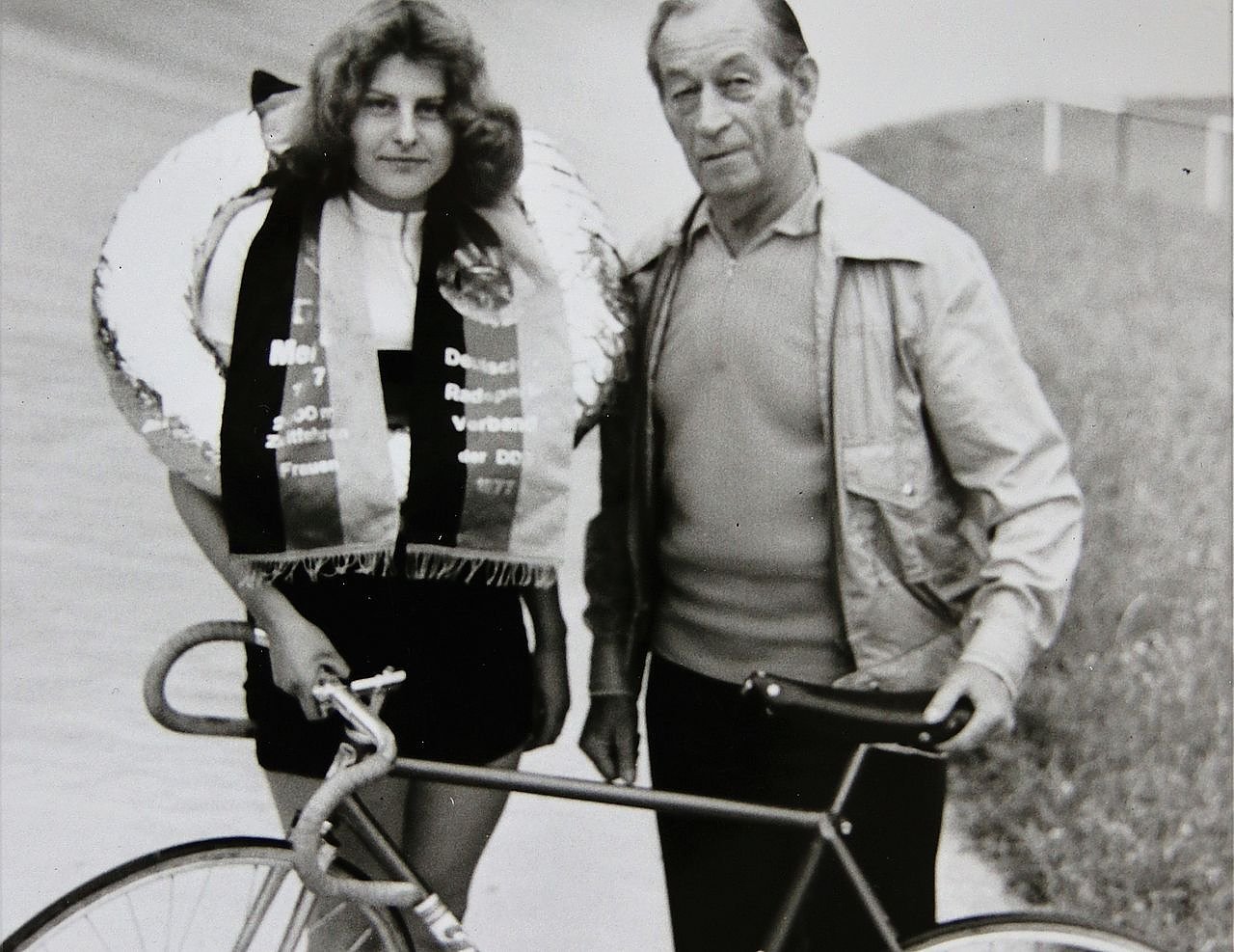 Hans Unger aus Niedersachswerfen war der erfolgreiche Trainer, der Birgit Bär, seine Enkelin Martina Unger im Jugendbereich und die auf dem Bild mit ihrem Trainer dargestellte Helga Tetzner im Frauenbereich zu DDR-Meistertiteln im Bahnrennsport führte.
