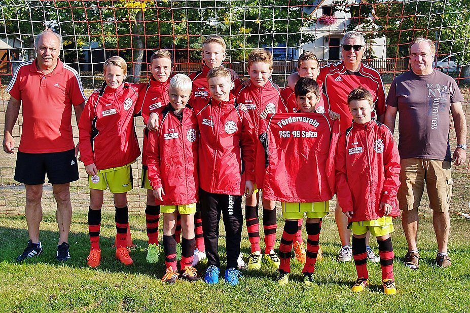 Vereinspräsident G. John und der Schatzmeister des Fördervereins Günter Graf waren die Überbringer der Sportausrüstung. Ein herzliches Dankeschön kam von der Mannschaft und ihren Übungsleiter und den Betreuern. Voller Stolz ging es dann ins erste Punktspiel gegen die Mannschaft von der D II Junioren von Wacker Nordhausen, das die Salzaer mit 19:2 gewannen.