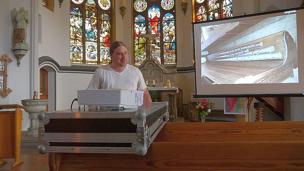 Empfangen und begrüßt wurden wir durch den Kreiskantor Andreas Fauß. Mit einer Fotopräsentation erläuterte er die Ausreinigung und Generalüberholung der Orgel.