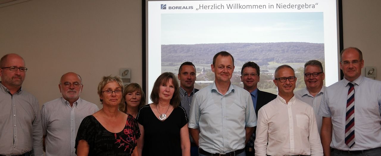Der Vorstand Polyolefine der Borealis AG Wien, Dr. Alfred Stern (3. von rechts) sowie weitere Führungskräfte des österreichischen Unternehmens sind heute in Niedergebra zu Gast. In den Vormittagsstunden besuchten sie das Unternehmen, anschließend stellten sie sich im Dorfgemeinschaftshaus von Niedergebra der Politik und der Wirtschaft der Region vor.