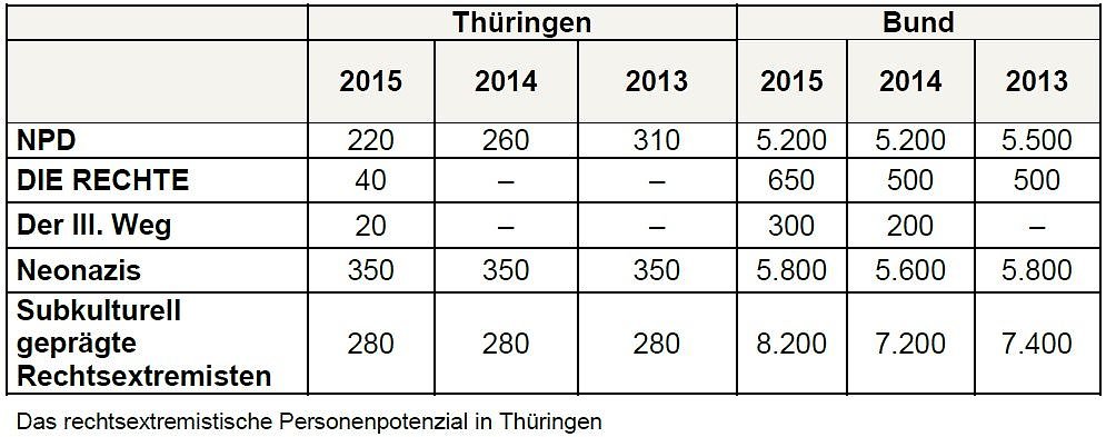 Der Rechtsextremismus stellt – wie in den Vorjahren – die Hauptgefahr für Thüringen dar, so Präsident Kramer. Die zentrale Bedeutung dieser Gefahr lässt sich dabei sowohl am Personenpotential (rund 900 Personen) als auch an der erheblichen Steigerung der politisch motivierten Kriminalität erkennen. Auch im aktuellen Jahr 2016 hält diese Tendenz an.