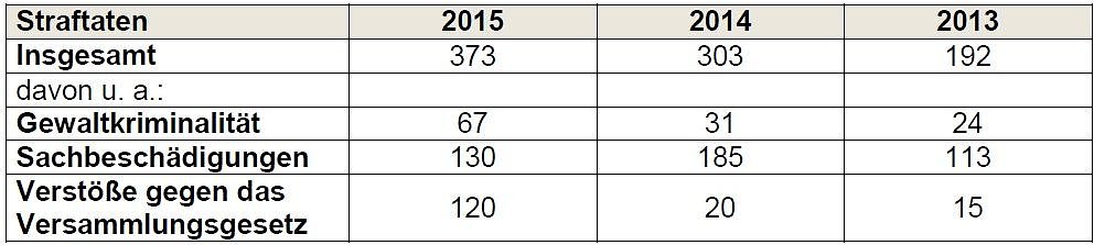 Betrachtet man die absoluten Zahlen der Delikte (2014: 303, 2015: 373) ist erneut ein Zuwachs zu konstatieren. Der Jahresvergleich 2014/2013 ergibt ein Plus von 111 Delikten.