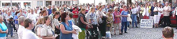 Viele andere Redner erinnerten an die Zeit vor 15 Jahren. In der damaligen DDR seien am Anfang auch nur einige Hundert Menschen auf die Straße gegangen und dann sei ein ganzes System gestürzt worden. Heutzutage soll zwar niemand gestürzt werden, doch ein Teil dieser Reformen müsse zurückgenommen werden. Fast flehentlich bat eine Frau mit zwei Kindern um Rücknahme, sie wisse sonst nicht, wie sie ab dem kommenden Jahr ihre Kinder ernähren könne.