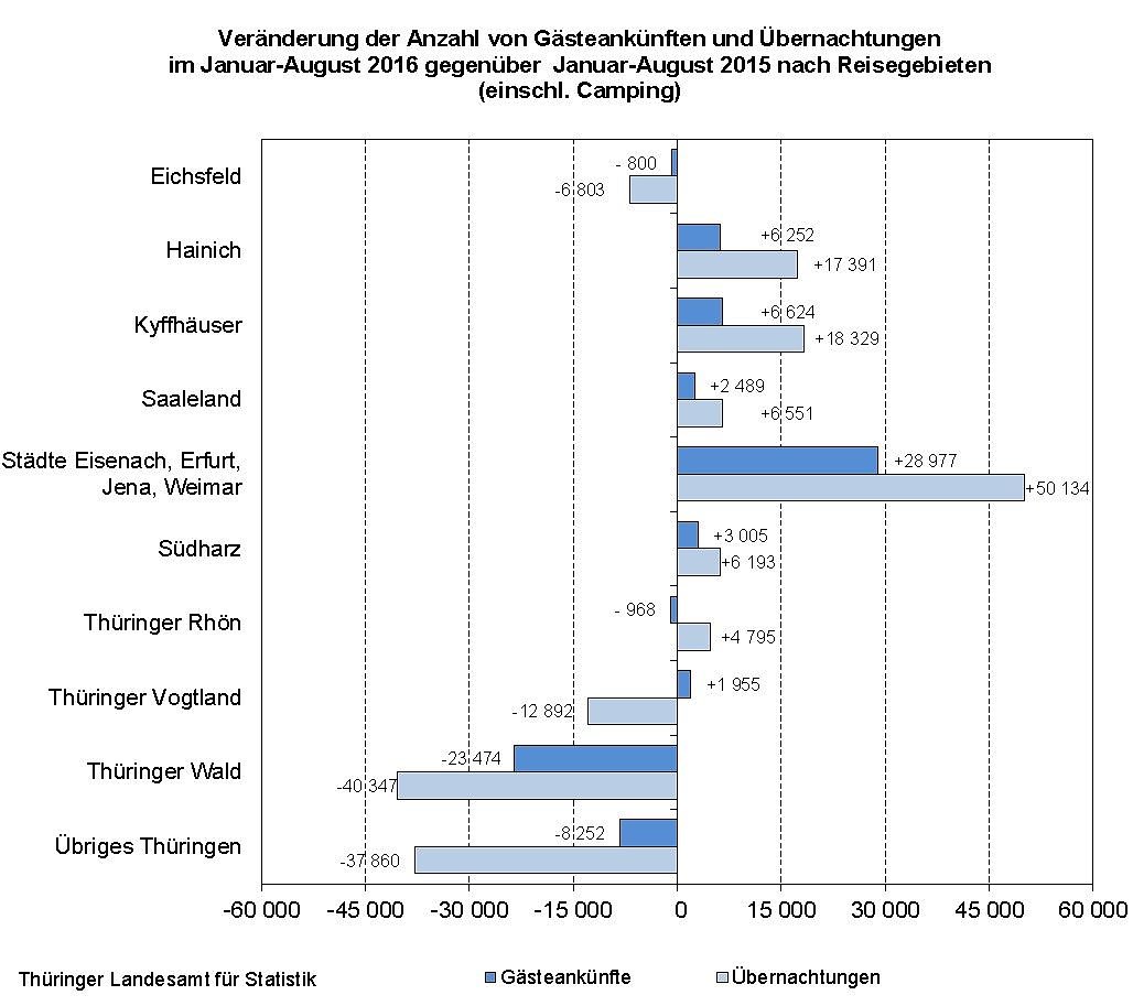 Das Reisegebiet der Städte (Eisenach, Erfurt, Jena und Weimar) erzielte in den ersten acht Monaten des Jahres einen Zuwachs in den Gästezahlen (+3,7 Prozent) und Übernachtungen (+3,6 Prozent). Auch die kleineren Reisegebiete (Hainich, Kyffhäuser, Saaleland, Südharz) erreichten in den ersten acht Monaten einen beachtlichen Anstieg der Gäste- und Übernachtungszahlen, andere Regionen konnten im Monat August wieder zulegen (Eichsfeld, Thüringer Vogtland).