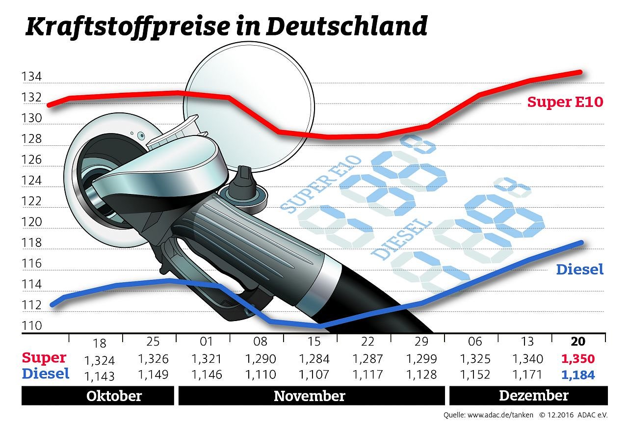 Zum fünften Mal in Folge sind die Preise für Benzin und Diesel im Vergleich zur Vorwoche gestiegen. Wie die Auswertung der ADAC-Kraftstoffpreisdatenbank ergibt, kletterte der Preis für einen Liter Super E10 binnen Wochenfrist um einen Cent auf durchschnittlich 1,350 Euro. Der Dieselpreis stieg um 1,3 Cent und kostet im Tagesmittel 1,184 Euro...