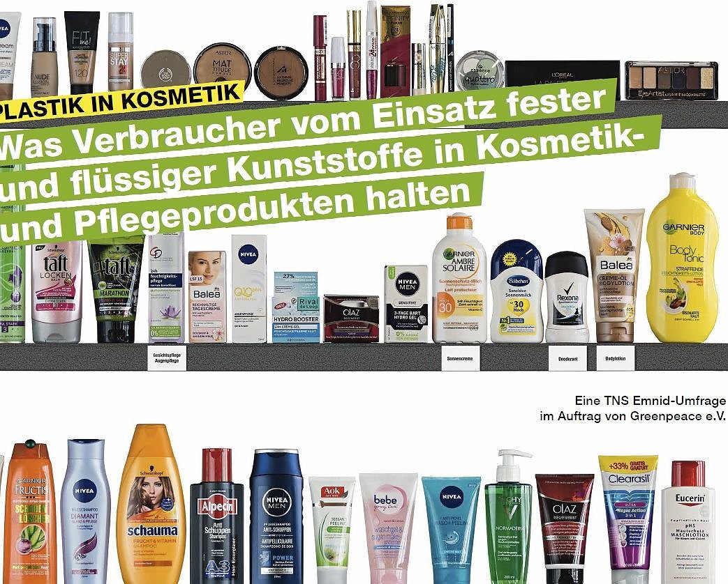 Die breite Mehrheit der Deutschen (83 Prozent) erwartet von den Kosmetikherstellern, dass sie auf Kunststoffe in fester, flüssiger oder anderer Form in ihren Produkten verzichten. Knapp drei Viertel befürworten sogar ein generelles Verbot von Plastik in Kosmetik- und Pflegeprodukten. Dies ergab eine repräsentative Umfrage, die das Emnid-Institut im Auftrag von Greenpeace durchgeführt hat...