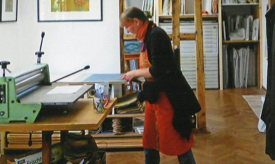Ihr Atelier befindet sich am Beginn der Nordhäuser Altstadt. Zwei prägende Bauwerke sind in ihrem Blick – der katholische Dom und die evangelische St.-Blasii-Kirche. Die Kranichstraße und der Blasii-Kirchplatz mit seinen Linden umrahmen das Gebäude. Durch eine breite Fensterfront erlebt sie die farbige Verwandlung des Gemäuers der Blasiikirche in den Tagesstunden und Jahreszeiten unmittelbar, da liegt das Meditieren nahe. Auch dadurch holt sie sich Anregungen für ihre Farbgestaltung auf den Ölmalereien und Druckgrafiken, insbesondere den vielschichtigen Farbradierungen. Gebautes und Gewachsenes verknüpfen sich. Die Stadtlandschaft mit ihrer in Jahrhunderten gewachsenen Architektur regt zur Gestaltung an, gleichfalls das Landschaftliche. Die Bergwelt des Harzes zum Beispiel liegt ja unmittelbar vor der Haustür mit Mischwald, mit urigen Gesteinsformationen, mit einer vielgestaltigen Pflanzenwelt.