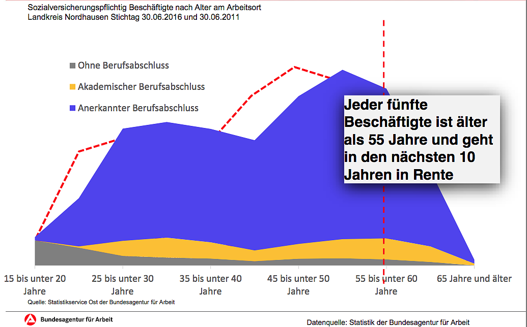 "Altersgebirge" der regionalen Wirtschaft heute und 2011 (rot) (Foto: Agentur für Arbeit Nordhausen)