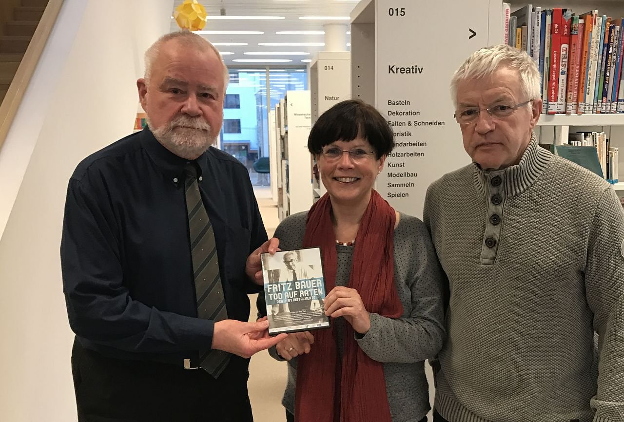 Jost Rünger vom Kulturbund für Europa und Dr. Helmut Fischer übergeben Hildegard Seidel den Film für die Stadtbibliothek.