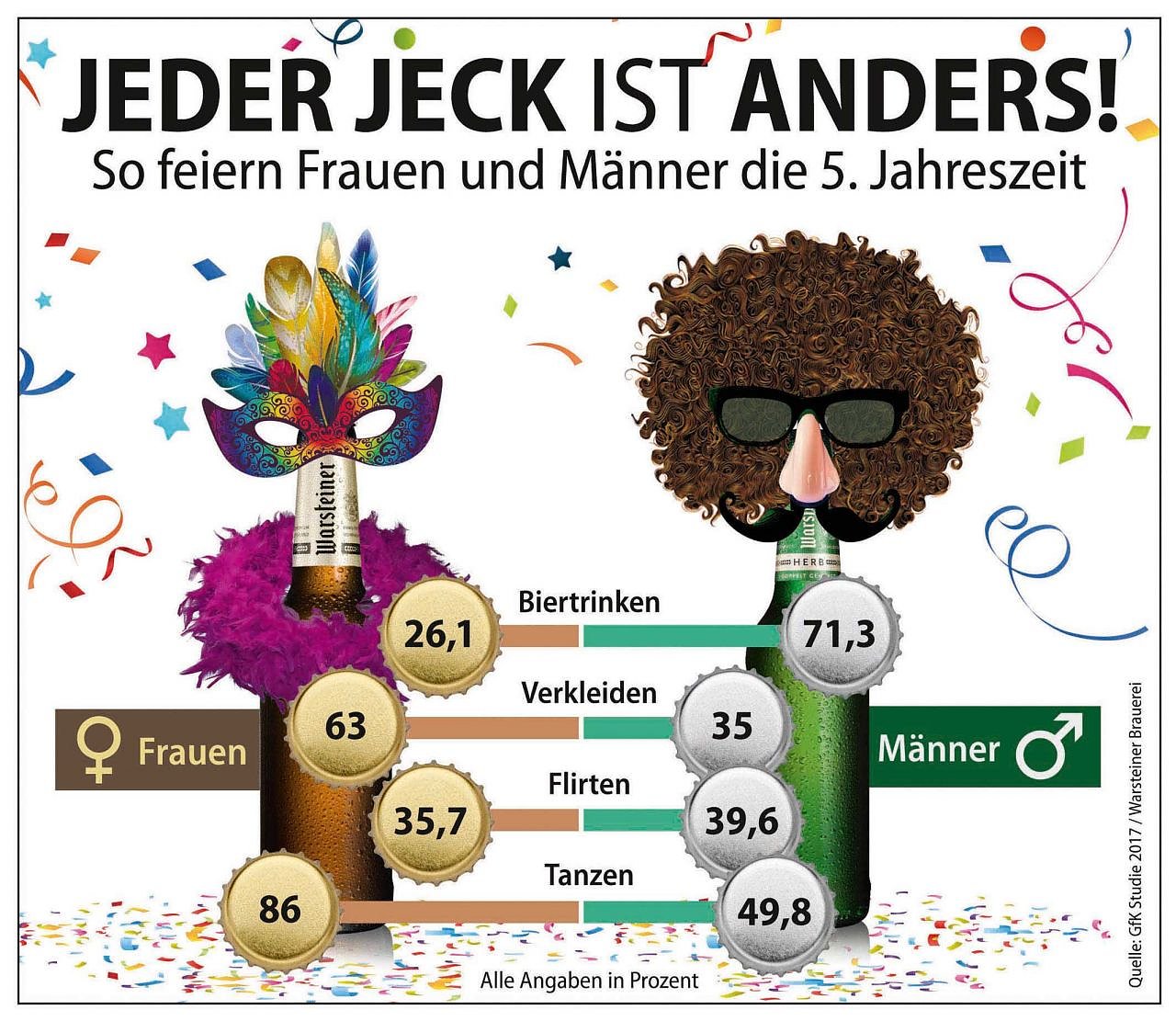 Autor: redFreuen sich die jecken Herren vor allem beim Feiern auf ihr Bier, schwingen die närrischen Damen lieber das Tanzbein. Nur beim Flirten sind sich die männlichen und weiblichen Karnevalisten einig, wie die Ergebnisse einer repräsentativen GfK-Umfrage* im Auftrag der Warsteiner Brauerei belegen.