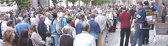 Hans Herrmann Hoffmann von der Thüringer Arbeitsloseninitiative erinnerte die Menschen an das Versprechen der Schröder-Regierung bei ihrem Amtsantritt im Jahr 1998, die Arbeitslosigkeit halbieren zu wollen. Stattdessen sei der Vermögen der Vermögenden immer größer geworden. Die Arbeitslosigkeit übrigens auch. Im Mittelpunkt weiterer Reden stand denn auch die Aussage von Bundespräsident Horst Köhler, dass es keine Angleichung der Lebensverhältnisse zwischen Ost und West, zwischen Nord und Süd geben werde.